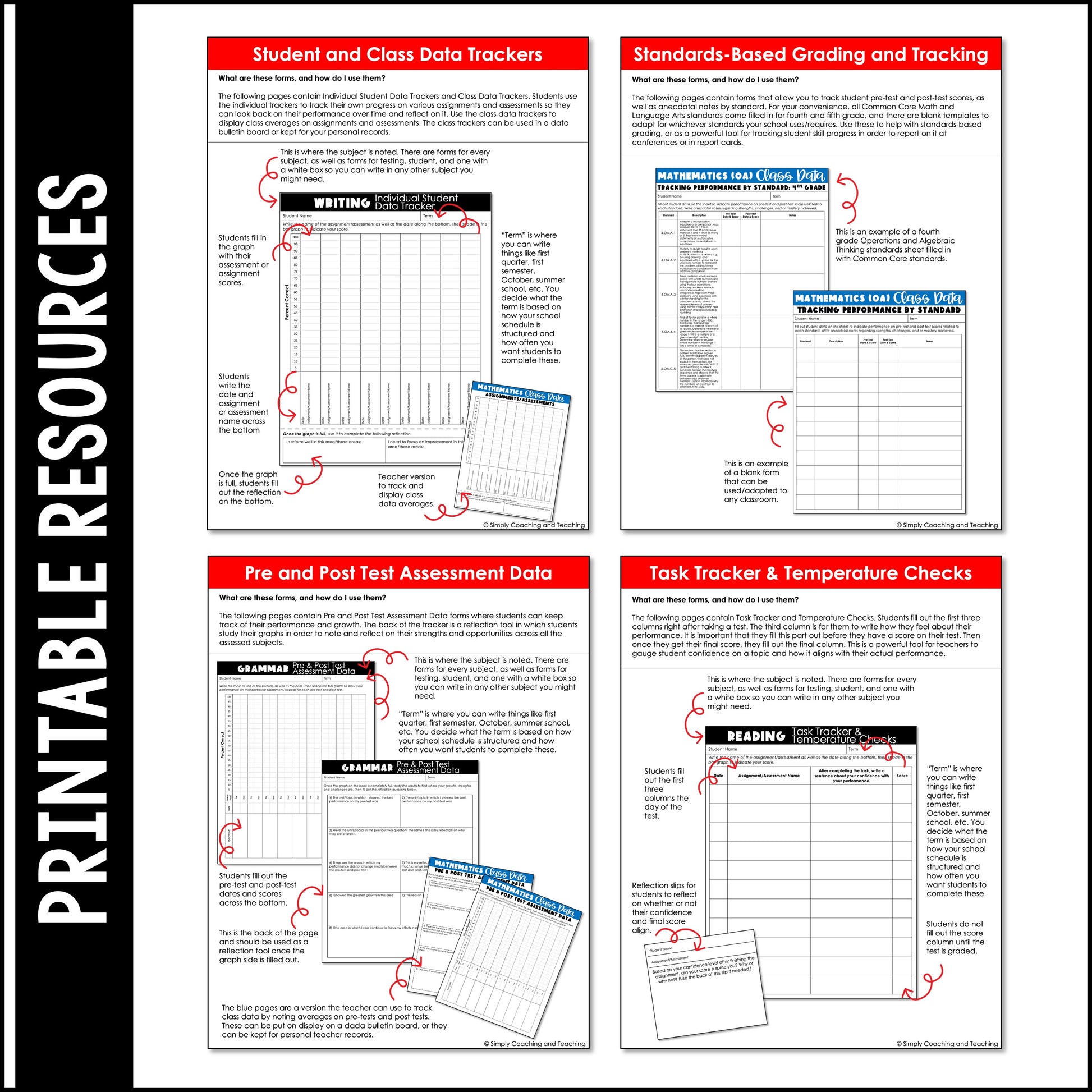 - Whole-class and individual pre- and post-test data trackers